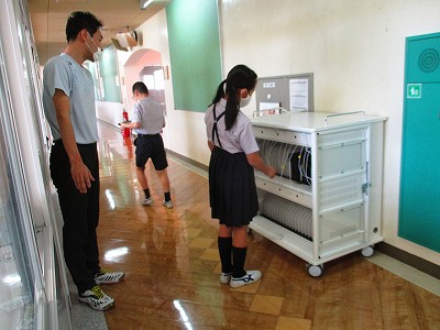 2校時は、各個人が使用するiPadを取り出して、授業支援アプリ「ロイロノート スクール」 を使いました。情報担当は岡崎先生です。