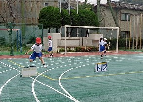 まずはハードルの準備。慣れるまでは、段ボールのハードルを使用して練習します。
