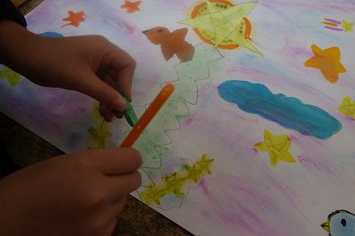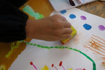 そこで,削ったコンテの粉をこすりつけることで「コンテ+コンテ」「絵の具+コンテ」で混色したり,絵の具を付けたスポンジを押し当てて,筆とは違ったあとを試したりして楽しそうに試していました。