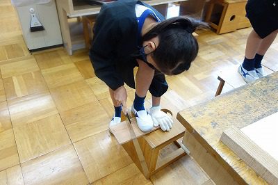 今日から「ギコギコ・トントン・クリエイター」の学習です。昨年に学習した「ギコギコ・トントン」にくらべて,今回は実際に使えるものをつくる「クリエイト」の要素がめあてに入ります。