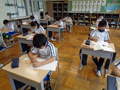 今日の算数は、「垂直・平行と四角形」の最後の授業です。教科書のたしかめ問題を復習したあと、テストを行いました。