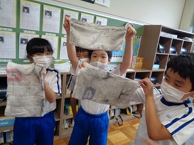 4年生は人数も少なく、掃除をするのも実は一苦労。しかし、皆さんは大変お掃除上手なので、床を拭いたぞうきんも真っ黒になりました。「これだけ汚れたよ!」とみせてくれた皆さんでした。