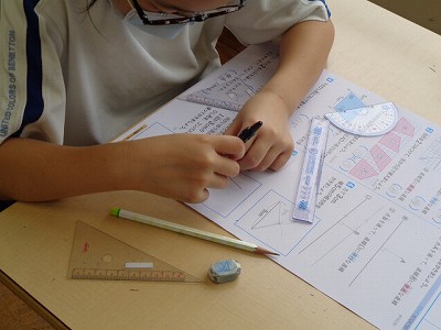 三角定規やコンパスをすべて使って、角度や長さに注意しながら垂直や平行の線、長方形や平行四辺形を作図していきます。明日からは、「小数」の単元に入ります。