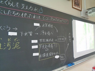 京都市の上下水道局のビデオを見ながら、下水のしくみについて確認します。すると、京都の水は「水環境保全センター」という下水処理施設できれいな水になっている事や、川へ流れて大阪湾へ出ていくことが分かりました。