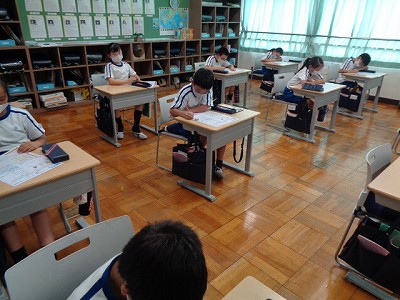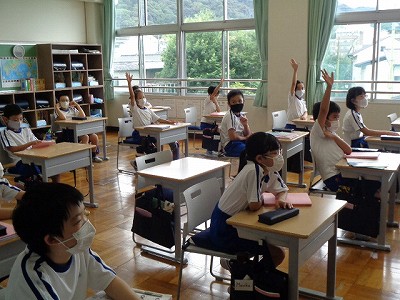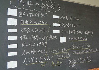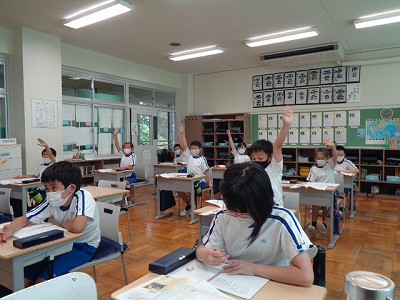 最後の学活は、1学期を振り返り、2学期にむけての目標を決めました。1学期を振り返り、出来ていなかったことは無いか、クラスで出し合います。その中でも「感染対策のためのルールを守ること」がまだまだできていなかったことを反省し、2学期は「無言右側歩行」「5分前行動」といった生活目標を学級全体で持ち、過ごしていく事を決めました。