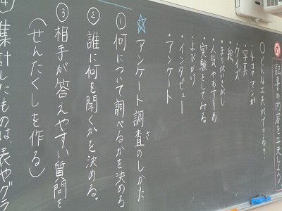 その中で「アンケートを取る」という記事の工夫に着目し、アンケートを取る時のポイントを、教科書を見ながら確認しました。