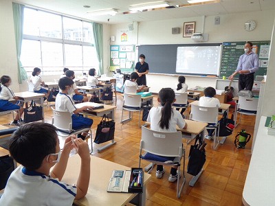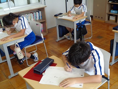 全問正解を目指して、これまで家庭学習などを頑張っています。満点の人も多く、皆さんの1学期の頑張りに拍手です。2学期初めに、もう一度確認テストを行います。夏休み中に忘れないように、何事もくり返す事が大切だという事を伝えました。