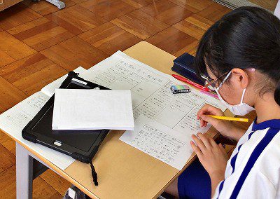 国語で学んだ新聞づくりのポイントと、社会で学んだ水に関する知識を使い、本やロイロノートを使って、記事を書いて行きます。わりつけや、記事の内容も工夫し、だんだんと下書きができあがってきました。