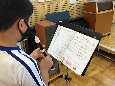 「♪ハローサミング」のリコーダーの練習から始めました。個人練習で、スピードを上げる練習を行っています。