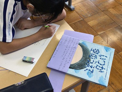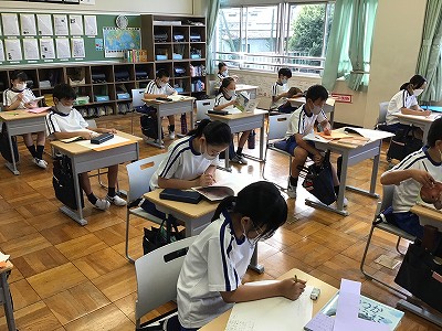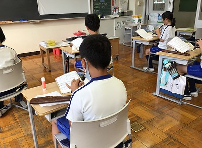 書写では、へんとつくりの漢字の構成によって、変わる文字のバランスを意識しながら、教科書を使用して「硬筆書写」を行いました。