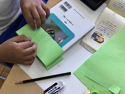 本に合わせた色画用紙を選び、サイズに合わせて帯を作成していきます。本の表紙の色と、色合いの工夫をしている人もいました。