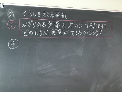 発電をする上で、どうしてもデメリットの方が大きくなるのは、人間の都合によって地球影響を及ぼしているからであり、今後どのように発電とつきあっていくべきかを学習問題にし、次は世の中のあらゆる発電について調べ学習をしました。中にはあっと驚くような面白い発電をみつけた人も!次の授業では、調べた発電をみんなで共有します。
