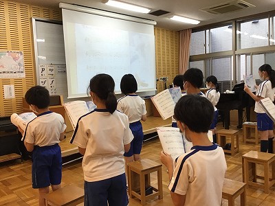 音楽室で「♪とんび」の歌唱学習を始めています。