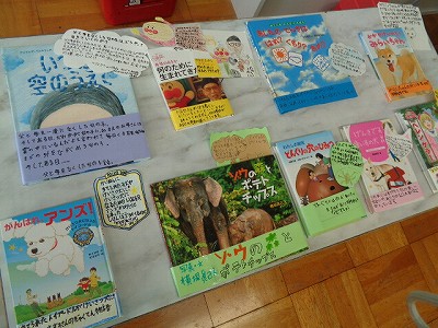 できあがった帯とポップをズラリと並べると、まさにそこは本屋さん!色合いや、文字の内容などを吟味し、みんなそれぞれ個性あふれる素敵な帯とポップが完成しました。