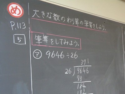 2けたでわるわり算も、1けたでわるわり算と同じように「たてる、かける、ひく、おろす」をくり返して計算ができるという学習を生かし、今日は「大きな数」のわり算にもチャレンジしました。4けたになっても、やり方は同じです。商の位置や、数字を下ろす場所に注意して、何度も計算練習をしました。