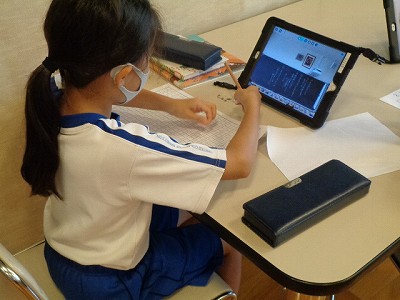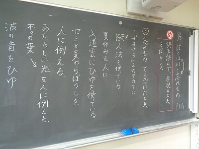 4時間目は国語の授業です。今日は、「忘れもの」という詩を読みました。「擬人法」がたくさん用いられた詩です。入道雲、セミ、木々の葉、夏休み、光…色々なものが擬人法によって表現豊かに工夫されていることに気づきました。