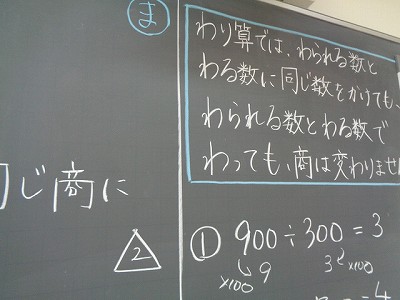 2けたでわるわり算の筆算という単元も、いよいよ終盤にさしかかってきました。ある程度、筆算にも慣れてきた様子の4年生ですが、まだまだ練習が必要です。今日は、「わり算の式がちがっても、商が同じになるわけを考えよう」という学習目標でした。算数においても、ただわり算の計算が出来るのでは無く、論理立てて説明ができるように、みんなで言葉を出し合いながら、わり算のしくみについて確認しました。