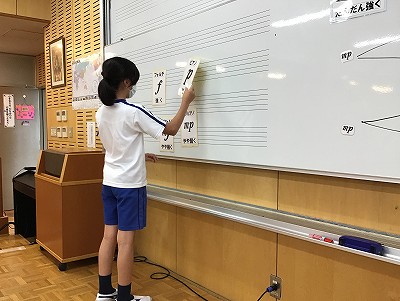 発表の時間です。相手グループの歌を聴いて、強弱のポイントを聞き当てる活動を取り入れました。