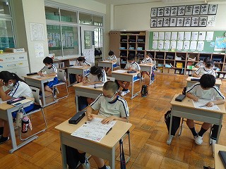 算数では「2けたでわるわり算」の確認テストを行いました。ミスの無いように、みんな集中して取り組みます。