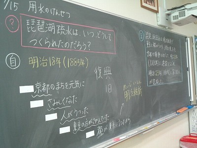 3時間目は、社会です。先週から、琵琶湖疏水についての学習を進めています。今日の学習問題は、「琵琶湖疏水は、いつ、どうしてつくられたのだろう?」です。琵琶湖疏水記念館で見てきたことや映像を見て学んだことをもとに、みんなで意見を出し合い、解決していきました。