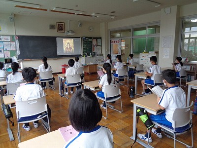 今日は、放送礼拝の日です。仏様に手を合わせ、姿勢を正して歌います。本日の校長先生のお話は、今週末の4連休についてでした。