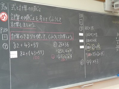 6時間目も、今日は算数を進めます。計算の順じょを使って、工夫して計算を行います。今日ならった、計算のきまりを使って「100のまとまりをつくる」という部分をポイントに、計算を行いました。