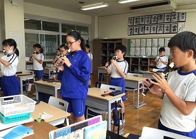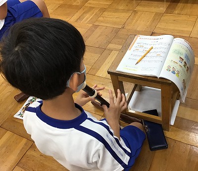 教室に戻り、リズミックに吹いてみると…低い「レ」「ミ」の音の息づかいが難しく、ひょろろ~と、裏返った音が出てしまいます。こちらも、繰り返しの練習が必要ですね。