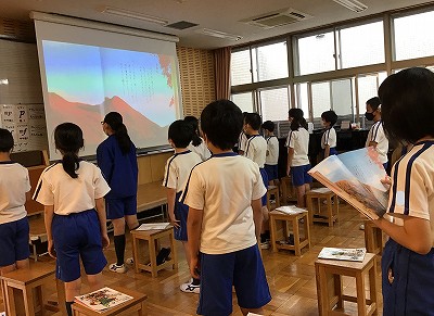 「もみじ♪」を歌唱しています。教科書の美しい写真の情景と、「渓の流れに散り浮くもみじ」や「裾模様(すそもよう)」など、歌詞から広がるイメージをふくらませて、歌っています。