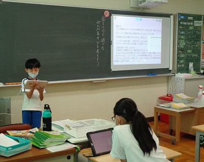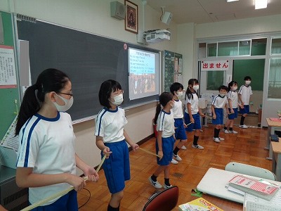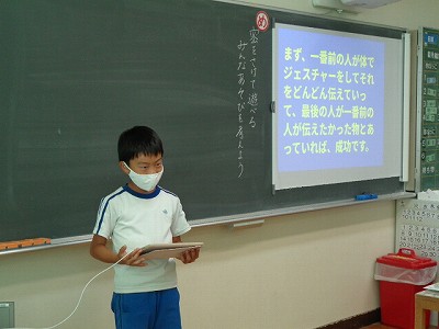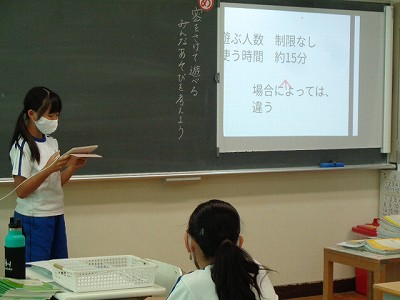 今日の1時間目は、学級活動でした。今日は「密をさけて遊べる、みんな遊びを考えよう」という目標のもと、みんなが調べたり、考えたりした「みんな遊び」を一人ずつ自分の言葉で全員にプレゼンテーションしました。それぞれ個性的でおもしろい遊びがたくさん上がりました。
