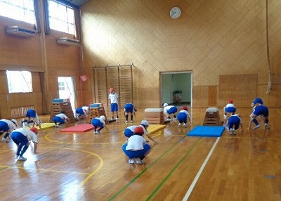 2時間目の体育は、今日から「とび箱」の学習が始まりました。けがをしないよう、手を使って念入りに準備体操を行います。