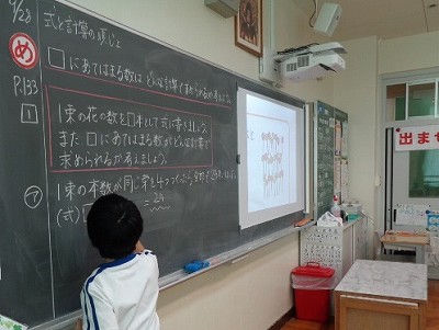 算数は「式と計算の順じょ」について引き続き学習しています。今日の学習目標は「□にあてはまる数は、どんな計算で求められているかを考えよう」です。□に置き換えた数で式を作り、計算を行いました。言葉の式に置き換えて考えるなど、どのような順の式にすべきかを話し合いました。