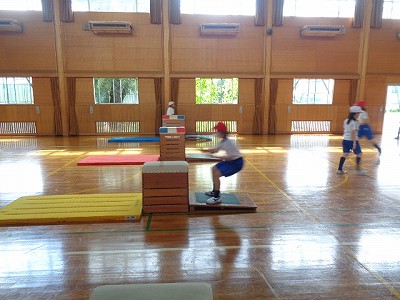 本日も「とびばこ」の学習を行いました。自分の飛べない段に、どんどんチャレンジをしていきます。まずは、かえるとびでウォーミングアップです。おしりをあげて床を蹴ることや、手のひらをしっかり着くこと、足を前にもってくることなどを意識しました。