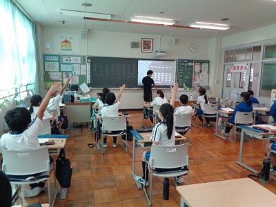 算数では、昨日に引き続き「そろばん」の学習をおこないました。昨日学習したそろばんの使い方をもう一度確認し、今日は「そろばんの九九」の表を見ながら、自分で5個以上の数の足し算を行いました。だんだん出来るようになってきた4年生、「そろばん楽しい!」という声も上がっていました。