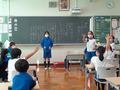 今日の1時間目は国語でした。国語では「クラスのみんなで決めるには」という学習をしています。クラスの中から、司会・時間係、記録係に分かれた「司会グループ」や「議題」を決め、今日は30分という限られた中で自分たちの話し合いを進めて行きました。