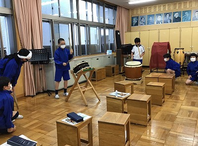 太鼓によって打点の高さの違う所に注意して、“たたく”のではなく、“太鼓を打つ”活動を取り入れました。16拍ごとに打ち手が変わり、途切れることなくリズムが続く“心地よさ”を体感してくれたことでしょう。
