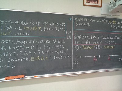 面積の学習が終わり、6時間目の算数からは、「がい数とその計算」に入りました。今日は、「がい数」とは一体何かという疑問からはじまり、「切り上げ」「切り捨て」「四捨五入」などの、がい数の単元学習において欠かせない新しい言葉も覚えました。