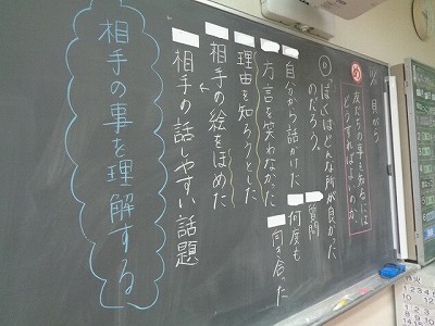1時間目は道徳の学習です。今日は「貝がら」という作品をみんなで読みました。この作品は「友達の事を知るためには」というテーマで書かれたお話です。友達の事をどれくらい思いやれているかという部分で、話合いをしました。仲よくなりたい友達とは、どのように接していけばよいのでしょうか。まずは相手の事をよく知って、良いところを探すことが必要だということが分かりました。