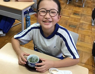 お茶をもらって嬉しそうな4年生。今日はこれを楽しみに頑張ってきました!