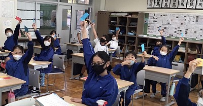 1時間目は、学級活動です。今日は、月かげ人権集会に向けて、まずはクラスの中で「コロナウイルス対策のためにがんばっていること」と「チャイムが鳴っているのに授業の準備が出来ていない状況」についての話し合いをしました。人権集会でも使用する「4色カード」を使用して話し合いを進めます。4年生の教室では、とくにチャイムが鳴ってからトイレに行ったり、算数プリントを続けていたり、授業の準備が整っていない事があり、出てきた意見には、みんなが共感し、改善していかなければならない現状について、クラス全体で実感しました。
