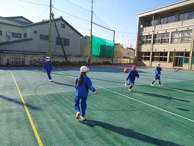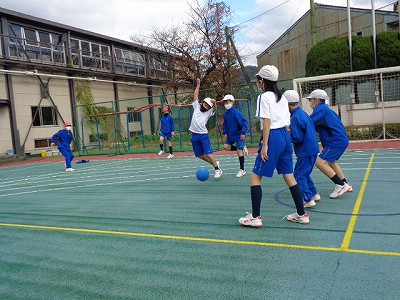2時間目の体育では、今日から「ポートボール」の単元に入ります。今日はまず、ポートボールのルールについての確認と、チーム分けを行い、グラウンドに出てボールを触りました。ドリブルの練習をしたあと、チームに分かれてパス練習をし、最後に少しだけ試合を行いました。
