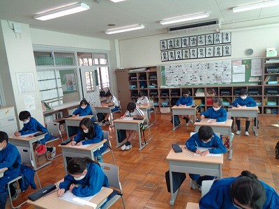 4時間目の国語では、漢字の50問テストを行いました。この日のために、家庭学習でも練習をしてきた人がたくさんいました。自分の結果に納得のいった人も、いかなかった人も、何度も見直しをして最後まで真剣に取り組んでいます。