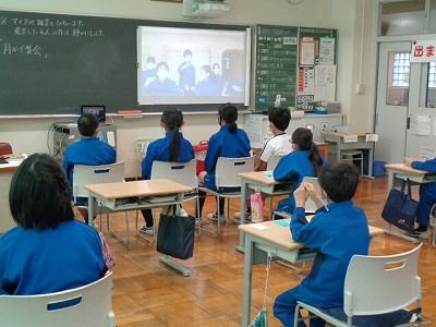 今日は、全校でリモート形式での月かげ集会が行われました。教室では、画面を通して他学年や児童会とつながります。