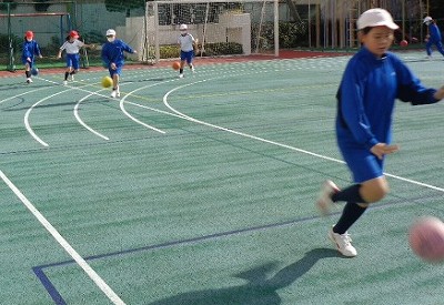 体育は3回目のポートボールです。まずは、ボールになれるためドリブル練習とパスの練習からはじめます。ボールに振り回されながらも、必死にコントロールし、グラウンドを1周します。