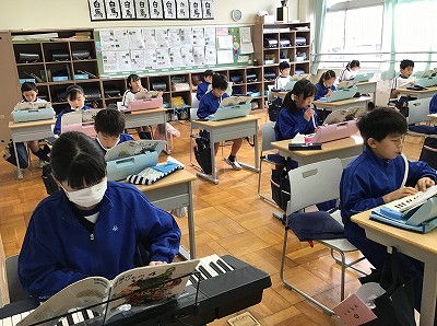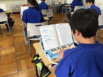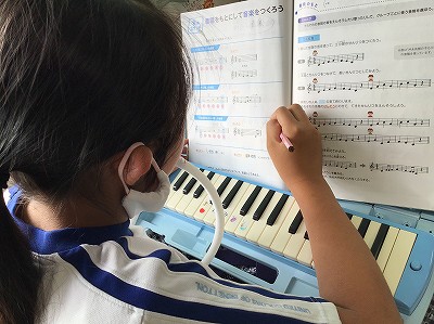 教室に戻り、早速、鍵盤ハーモニカを使って、“2小節の旋律づくり”に取り組みました。自分で選んだ音階でつくりはじめます。少しリズムを変えて楽しむことをアドバイスしました。