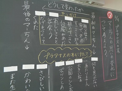 1時間目の国語は「プラタナスの木」の学習です。今日は、登場人物「マーちん」が、プラタナスの木へ寄せる思いの変化をとらえて、そのきっかけを探しました。