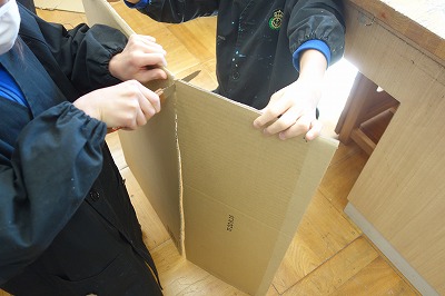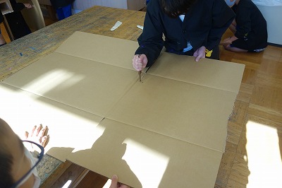 今日から、ダンボールを使っての学習です。ダンボールを思いついた形に切り、それに切り込みを入れて切込み同士を組み合わせ、接着剤を使わずに立ち上げていきます。提案したときは、みんなで一つの巨大な形をつくることになりました。