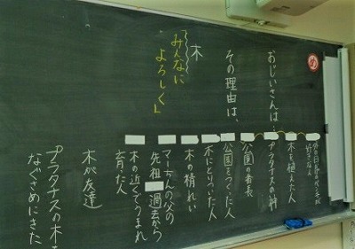 1時間目の国語は、引き続き「プラタナスの木」の学習です。今日は、プラタナスの木に登場する「おじいさん」が一体何者かについて、全員で予想し、考えました。今日の学習で大切な事は、「理由づけ」をすることです。本文中のどの文から、その予想ができるのか、自分の言葉で説明しながら発表を行います。