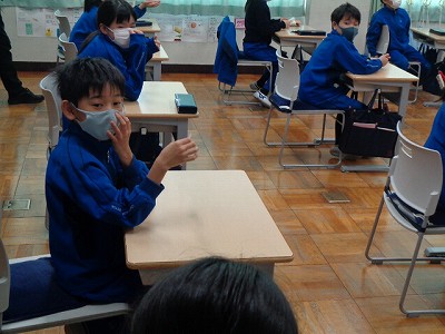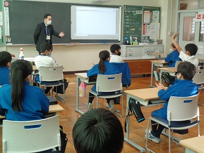 3時間目は、警察署からゲストティーチャーを迎えて、「非行防止教室」が行われました。非行防止教室では、実際に起きたネットやゲームでのトラブルや、いじめや暴力、万引きなどの事例を見ながら、クイズ形式で犯罪について学習を行います。特に、オンラインゲームの話やSNSの話は、4年生の周りでも身近に起きることです。他人事ではない話に緊張感が走ります。
