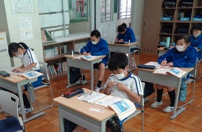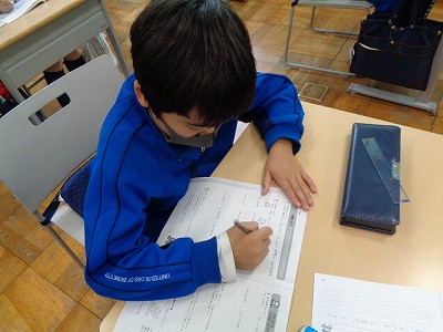 6時間目の算数は、小数のかけ算とわり算の知識を活用し、問題集を使用して応用問題に取り組みます。何度もくり返し、いろいろな問題を解くことで、かけ算の方法やわり算の方法を定着させていきます。