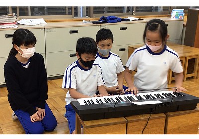 “日本音楽の音階”を使ったグループ2組目です。自分の作ったメロディを繰り返して演奏することで、聞いている人に強い印象を与えるように伝わりました。テーマがなかなか決まらなく、発表の時間が来てしまいました。「日本の春」と紹介し披露してくれたメロディに大きな拍手が沸きました。